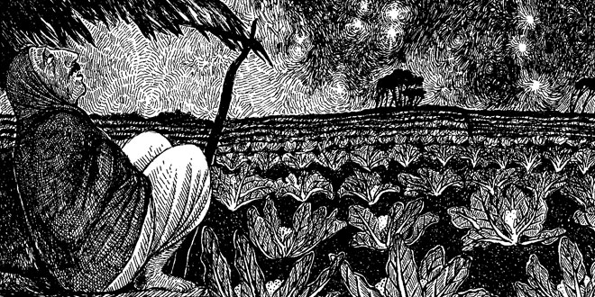 पत्तियाँ जल चुकी थीं । बगीचे में फिर अंधेरा छा गया था । राख के नीचे कुछ-कुछ आग बाकी थी, जो हवा का झोंका आ जाने पर जरा जाग उठती थी, पर एक क्षण में फिर आँखें बंद कर लेती थी !